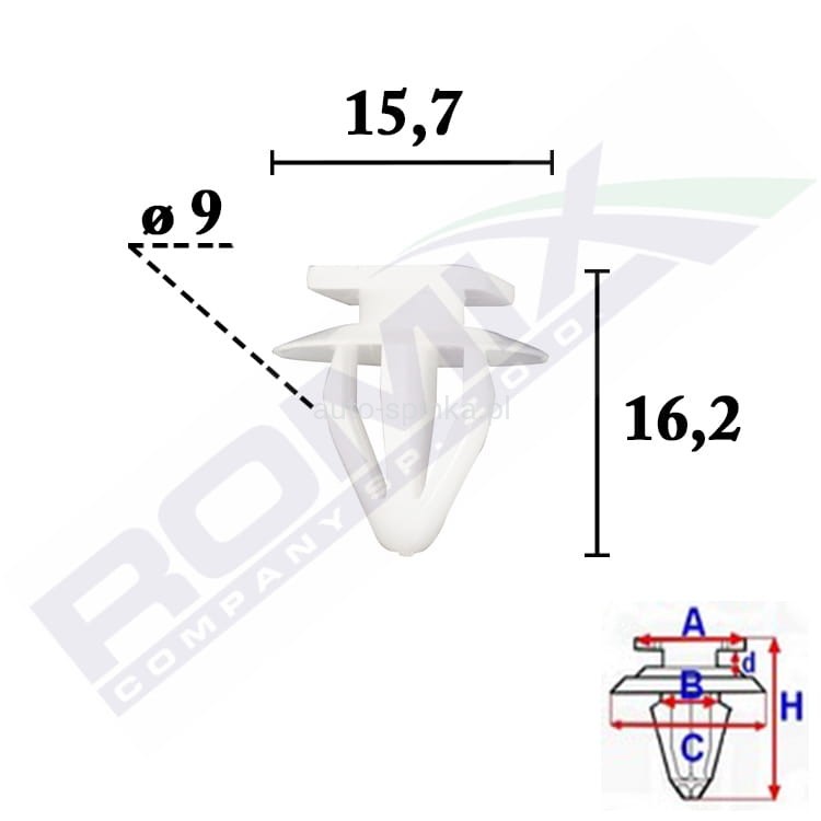 Wymiary: A 10,5x14 B 9 Ba 9,9 C 15,7 d 1,9 H 16,2 Ha 12 w otwór ø 9 mm