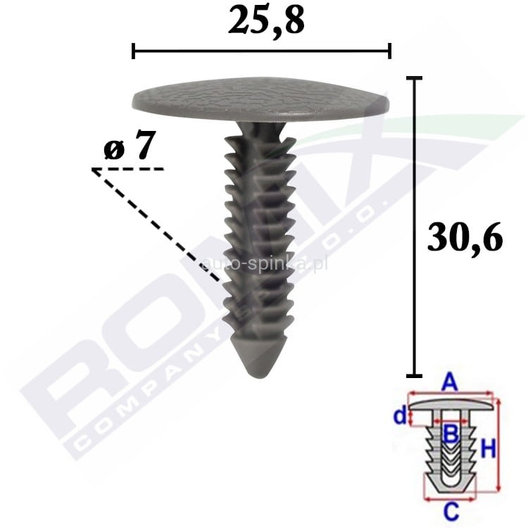 Wymiary: A 25,9 B 5,7 C 7,5 d 4,6 H 30,6 Ha 29 w otwór ø 7 mm