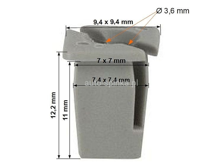Wymiary: A 9,4 B 9,4 C 3,6 E 7,4x7,4 F 7 G 7 H 11 na wkręt 4,8 mm