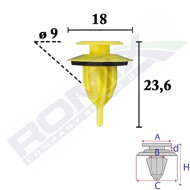 wymiary; A 12,9 B 8,4 Ba 9,5 C 18 d 2,5 H 23,6 Ha 19 w otwór 8,5-9 mm